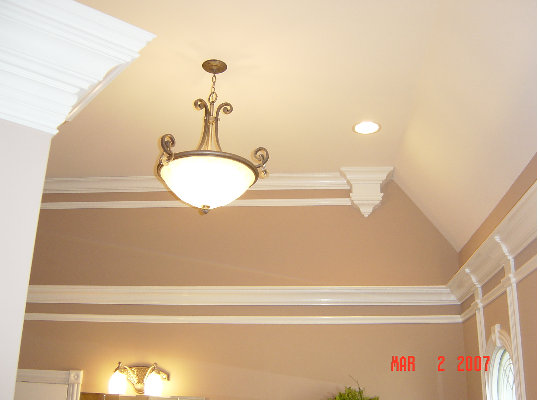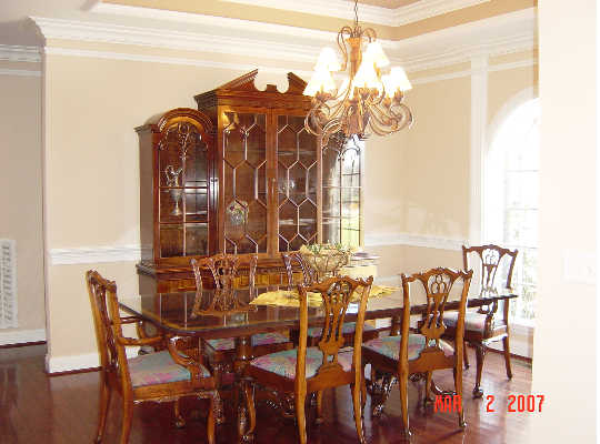 FORMAL DINING ROOM FEATURES ORNATE TREY CEILING WITH MEDALLION-BASED LIGHTING AND RICH HARDWOOD FLOORS